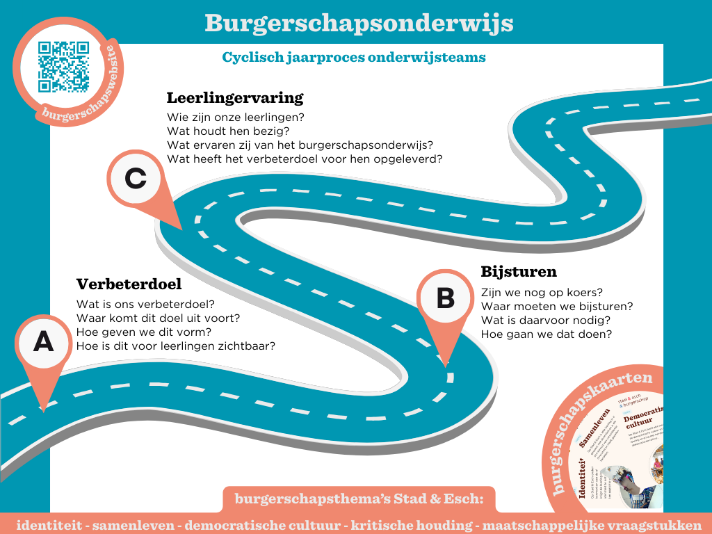 Bij Stad & Esch zijn we voortdurend bezig met het ontwikkelen van ons burgerschapsonderwijs. Dit doen we aan de hand van een cyclisch jaarproces, waarin we elk jaar evalueren, bijstellen en verbeteren. Op deze manier houden we het onderwijs actueel en betekenisvol. We stemmen de lessen af op de behoeften van onze leerlingen, zodat we hen optimaal kunnen voorbereiden op hun rol in de samenleving.
